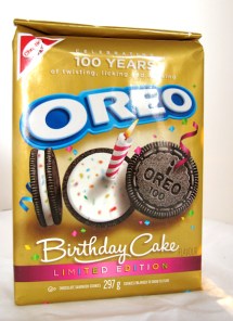 Happy belated birthday to the Oreo cookie! Who knew that little cookie has been around for 100 years? Well I didn’t. At least not until I spotted a bag of birthday cake flavored Oreos in my grocery store. I normally don’t buy Oreos because I’d end up eating the entire bag in one sitting. But the golden bag with the picture of the Oreo and it’s cream filled center decorated with sprinkles just caught my eye. And I thought I’d be stupid not to, so I bought a bag.