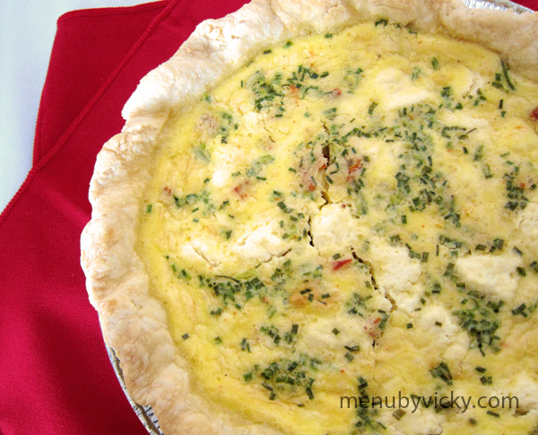• Thinly spread the sundried tomato pieces, chives and jalapeno pepper pieces and crumbled goat’s cheese into the pre-baked pie crust. Pour the egg and cream mixture into the pie shell carefully.