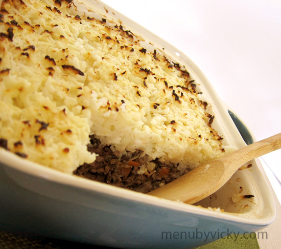 The recipe for cauliflower shepherd’s pie was posted by my friend Rebecca over at Rapunzel’s Adventures. If you haven’t been over to her blog, you should definitely have a look. She’s got a lot of posts on exercise routines along with videos that show you how they’re done. So make sure you bookmark her site on your smart phone and take it along with you the next you hit the gym.