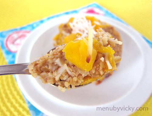 I like using produce that’s in season and one of my favorites is mango. Its sweet and fruity flavor can perk up any dish that it’s added to. And what else goes really well with mango? Coconut of course! The two flavors combine to give this oatmeal a unique tropical twist. It’s a great change from boring brown sugar or plain old maple syrup. Baking the oatmeal also gives the dish a chance to soak in all of the sweetness and flavor from the mango and coconut. My favorite is the coconut oil which gives the oatmeal a rich “creamy” taste without making it heavy. Best of all, if you triple the recipe and bake up a batch on the weekend, you can make enough breakfasts for the rest of the week. They’re portable and easily re-heated. Perfect for those of you who are busy and on the go. What are you waiting for? Go and give this recipe a try. Enjoy!