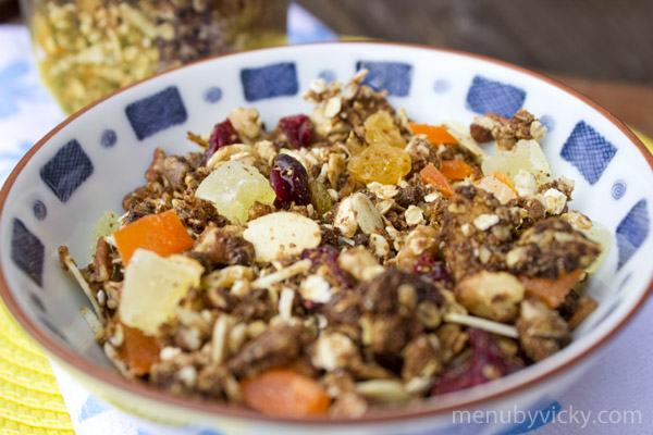 - Allow the granola to cool completely and then add in the dried pineapple, raisins, dried cranberries and dried mangoes.