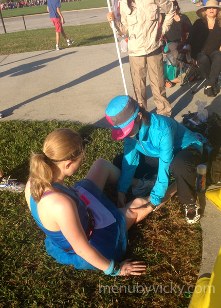 Shortly after reaching the front of Animal Kingdom, Rebecca said she was having knee pain and that it hurt to run. The course outside the park was quite narrow – maybe three people wide and there was no way for us to stop. So the three of us walked for a few minutes before we were able to find a bench we could sit down on. I wasn’t really sure what I could do to help out nor was I sure where the next med tent was.