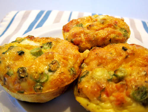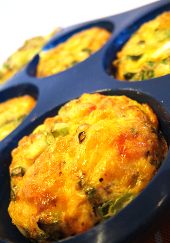 For my egg muffins, I used a southwest seasoning blend, salsa, green onions, chicken bacon and a bit of emmental cheese. But if you don’t like that combination, use a Greek seasoning, some black olives and feta cheese. Maybe you want to go with a western style omelet and use onions, ham and cheddar. Or get fancy and use some prosciutto, goat cheese and asapargus. There are a ton of combinations. Go crazy and use your imagination! After you’ve finished baking and they’ve cooled off, put them into a plastic sandwich bag and presto, you’ve got breakfasts for the rest of the week. You can easily reheat them in the microwave or eat them cold. Paired with a piece of fruit and a mug of green tea, you’ve got a nice and healthy breakfast.
